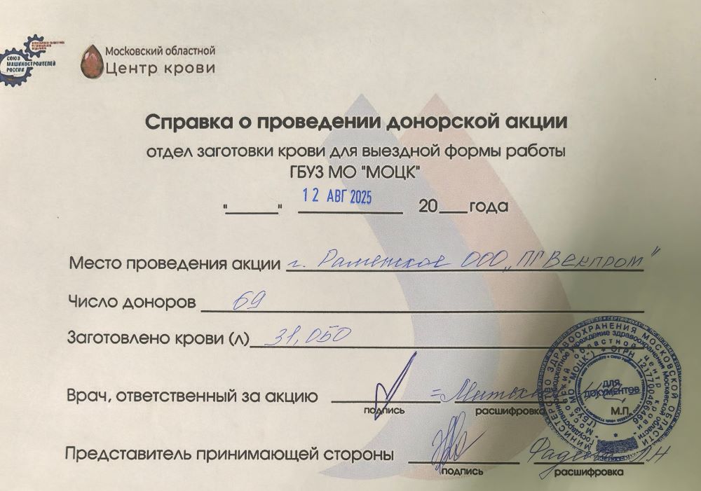 12 августа в раменском ООО «ПГ «ВЕКПРОМ» состоялся День донора. Акция, организованная Московским областным РО СоюзМаш и Московским областным центром крови, объединила многих сотрудников компании.
