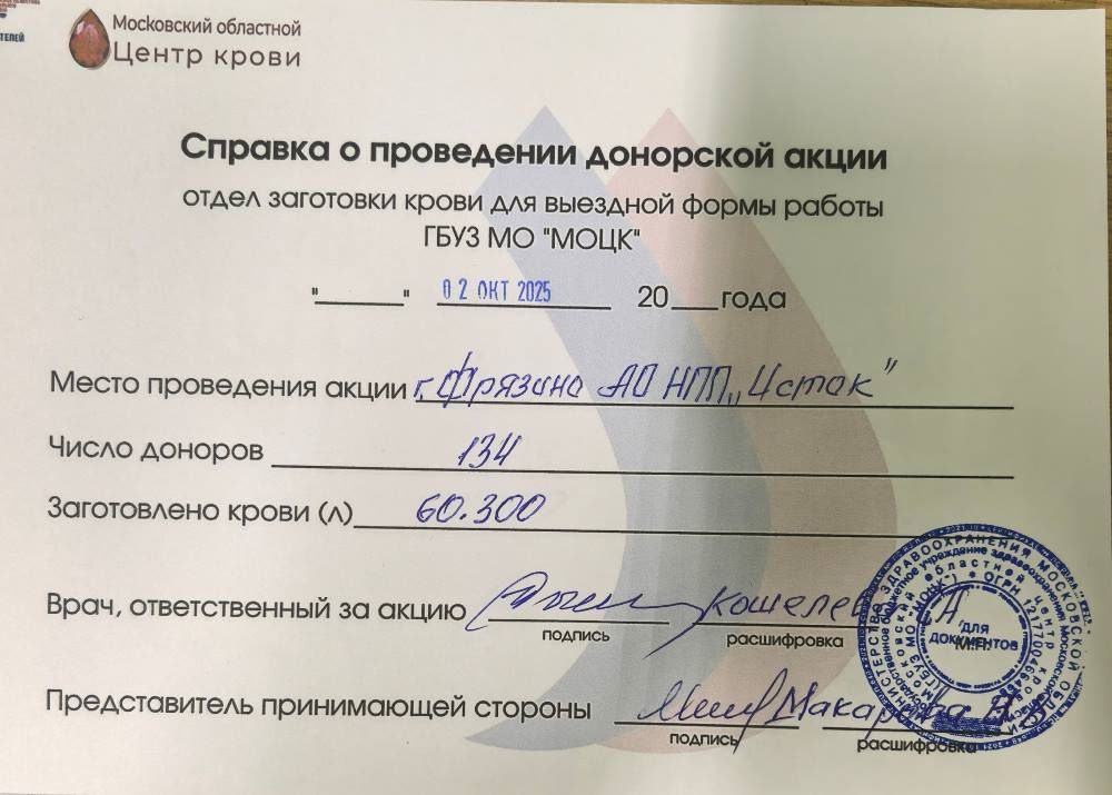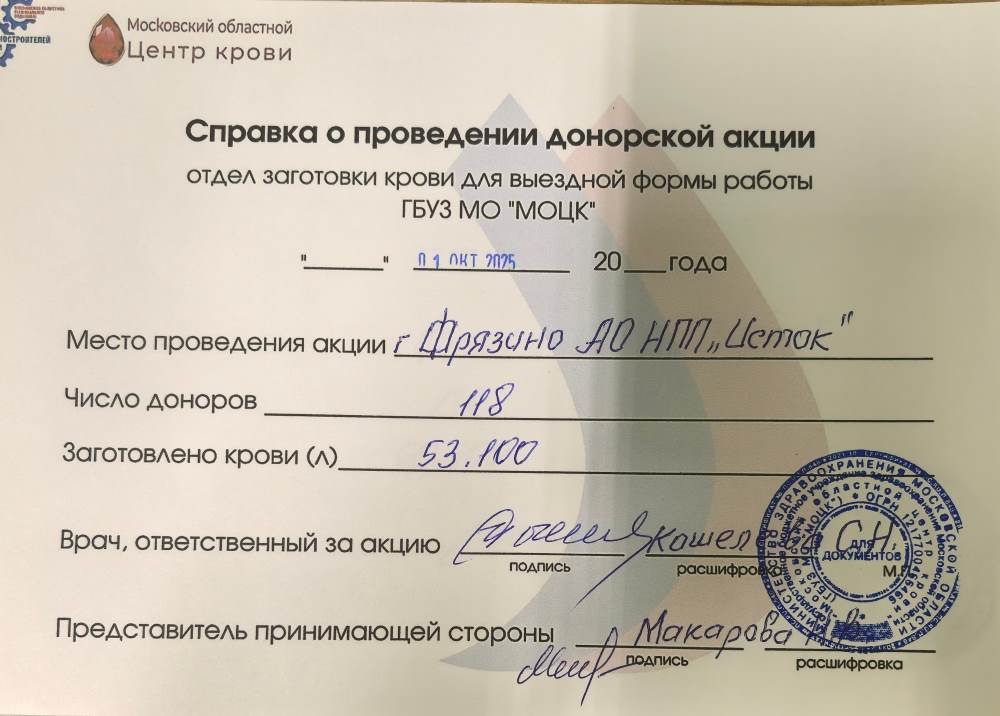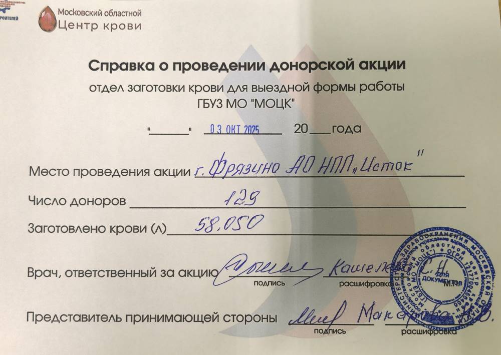 Акция проходила на базе АО «НПП «Исток» им. Шокина. За три дня мобильный пункт забора принял 381 сотрудника предприятия: всего удалось заготовить 171,45 л крови. Ее направят в медучреждения региона и столицы, где кровь и ее компоненты помогут спасти многие жизни.