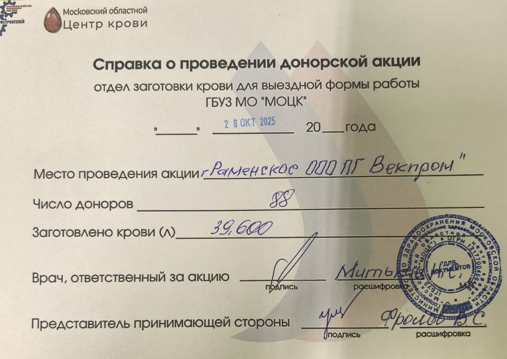 28 октября 129 человек пришли поделиться своей кровью с раненными воинами СВО и жителями новых территорий в технопарк ВЕКПРОМ, расположенный в Раменском районе Подмосковья. Акция добра и милосердия была организована компанией совместно с Московским областным региональным отделением Союза машиностроителей России и Московским областным центром крови (МОЦК) в рамках программы «Корпоративный донор Подмосковья».