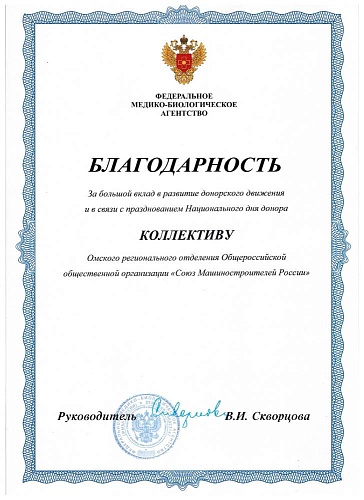 «Добровольное массовое донорское движение под эгидой Союза машиностроителей в Омске развивается, — отмечает первый заместитель председателя Омского РО Владимир Дорохин. — Сейчас 15 предприятий и учебных заведений проводят донорские Акции. В апреля присоединяются ОмГУ им. Достоевского и ООО «НХПТ», в мае — автобронетанковый инженерный институт. Только в апреле на 7 предприятиях и учебных заведениях будет организовано 11 донорских Акций. За вклад в развитие донорского движения Омское РО СоюзМаш России награждено Благодарственным письмом ФМБА. 17 апреля накануне Национального дня доноров мы совместно с федерацией омских профсоюзов, министерством здравоохранения Омской области проводим торжественное собрание, на котором будем чествовать доноров и организаторов, волонтеров».