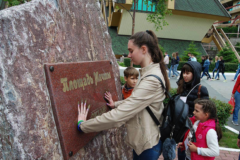 После плотного обеда участники экскурсии направились загадывать желания на Площади мечты и около камня любви, осмотрели огромную сцену под открытым небом, автогород, который больше всех других объектов привлек внимание мальчишек, ведь здесь также расположена выставка ретро-автомобилей. Чуть дальше дети обнаружили Камень дружбы, украшенный разноцветными отпечатками ладошек, и, конечно, тут же побежали к нему.