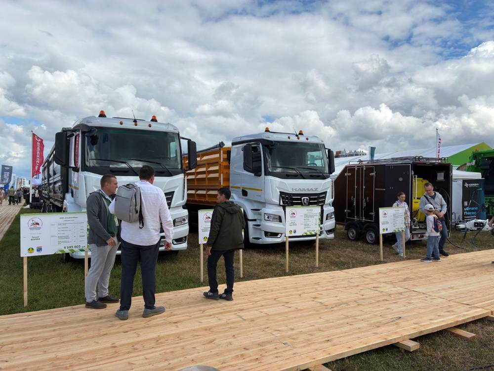 «КАМАЗ» на выставке презентовал грузовую автотехнику новейшего поколения К5, актуальную для аграриев. В экспозиции компании демонстрировался самосвальный автомобиль-зерновоз КАМАЗ-653557 (в сцепке с прицепом ТЗА-589305), предназначенный для перевозки зерна и других сыпучих сельскохозяйственных культур. Колёсная формула – 6х2, задняя ось – подъёмная. К преимуществам можно отнести широкий диапазон объёма загрузочного пространства и минимальную собственную массу самосвальной платформы при необходимом запасе прочности. Также среди особенностей – пескоструйная обработка поверхности грузовой надстройки перед окраской и двухслойная окраска грунтовка-эмаль грузовой надстройки. Размеры платформы: 6800х2540х1700 мм, её внутренний объём составляет 28 куб.м. Грузоподъёмность – 17,6 т. Что касается бортового прицепа-зерновоза ТЗА-589305, то объём его платформы составляет уже 34 куб.м. Разгрузка осуществляется на три стороны (боковые и задняя), стык нижнего и верхнего яруса бортов герметичный, также стоит отметить простоту и надёжность запоров бортов. Масса перевозимого груза – 18,5 т., полная масса – 24 т.