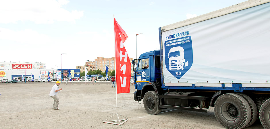 На специально отведённой площадке перед гипермаркетом «Эссен» организаторы развернули сцену, установили несколько палаток, расставили специальную разметку для проведения конкурса. А на старте уже стоял бортовой КАМАЗ. Участники соревнования должны были проехать на нём небольшой туннель, кольцо, выполнить «змейку», миновать второе кольцо, вернуться назад, где их ждал последний этап, специальный, приуроченный к ЧМ-2018, – игра в футбол на грузовике. Здесь они должны были забить бампером мяч в ворота с нескольких метров. Интересно, что изначально конкурсантов разделили на две команды – белых и синих. В случае ничьей по одному участнику из каждой команды поочерёдно пробивали бы пенальти с 20 метров. Однако в итоге водители в белых футболках победили с небольшим отрывом и были вознаграждены футбольными мячами.