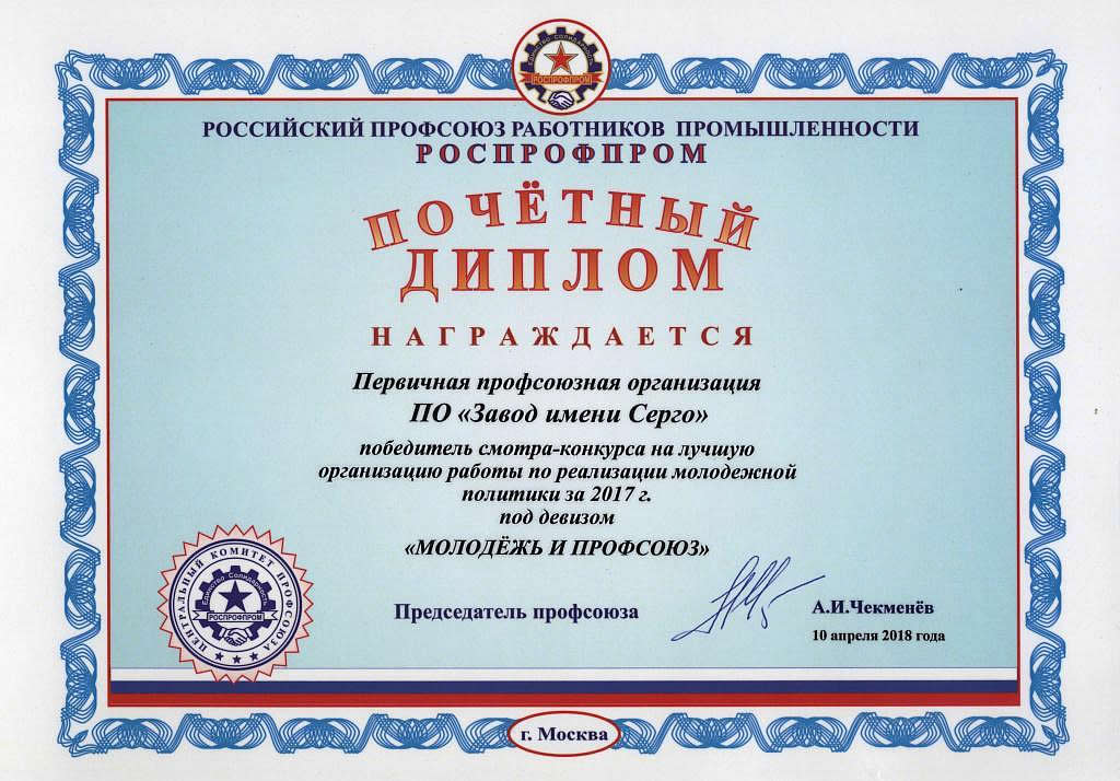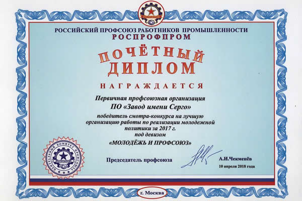 По итогам прошлого года из 4822 работников предприятия более 31% составляли молодые специалисты, почти все они являются членами профсоюзной организации завода. Молодежной организацией регулярно проводятся мероприятия производственно-научной направленности, культурно-массовые и спортивные праздники. Также молодые серговчане активно участвуют в профессиональных конкурсах и в мероприятиях муниципального, республиканского и всероссийского уровня. Эти и другие достижения в комплексе обеспечили POZIS первое место в смотре-конкурсе.