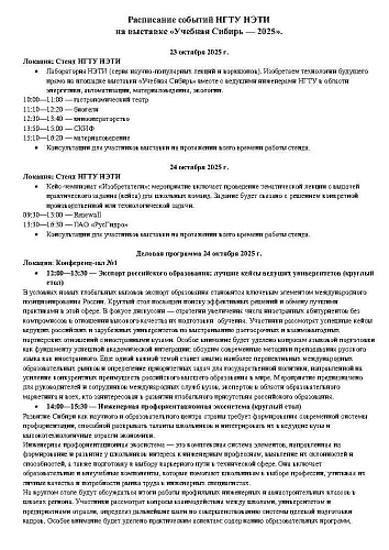 23 октября на стенде вуза будет работать «Лаборатория НЭТИ» — серия научно-популярных лекций и воркшопов по энергетике, материаловедению, кинооператорству, изобретательству и даже гастрономии. Здесь гости смогут сконструировать технологии будущего вместе с ведущими инженерами и исследователями вуза. Будут представлены инновационные разработки по материаловедению, технологии для мегасайенс-проекта Сибирский кольцевой источник фотонов (СКИФ), биогели для медицины и бытового использования, созданные в рамках программы «Приоритет-2030», гастрономический театр.