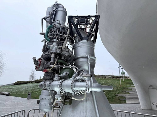 Перед павильоном установлен уникальный экспонат – полноразмерный макет ракетного двигателя НК-33, созданного ОКБ-2 в городе Куйбышеве (сейчас самарское предприятие ОДК-Кузнецов) под руководством конструктора Николая Кузнецова. Этот жидкостный ракетный двигатель создавался для установки на ракету-носитель сверхтяжелого класса Н-1, которая должна была доставить советских космонавтов на Луну и обратно.