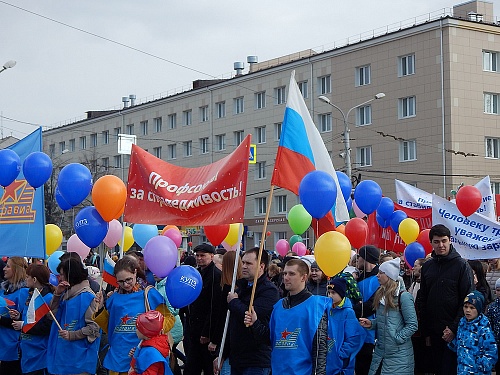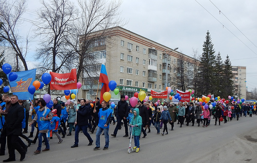 Шествующие несли флаги предприятия, профсоюза трудящихся авиационной промышленности и растяжки с лозунгами «С праздником Весны, Мира и Труда!», «Профсоюзы – за справедливость», «Пока мы едины - мы непобедимы» и другие.