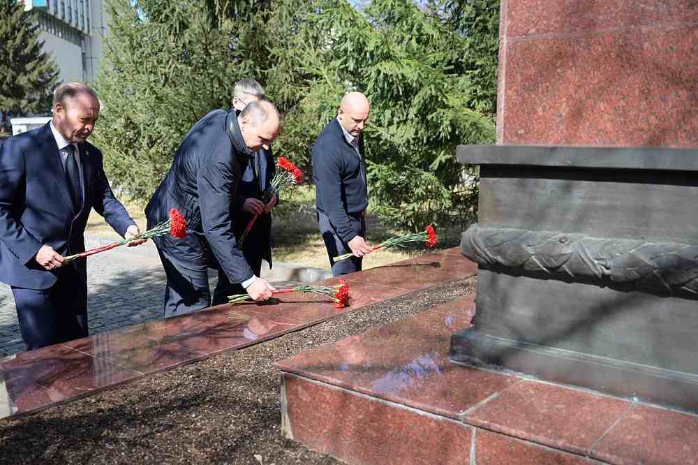 На территории завода делегация почтила память заводчан, ковавших Победу в Великой Отечественной войне, возложив цветы к мемориальной стеле. В 1941 году УОМЗ был эвакуирован в Свердловск и производил критически важные для фронта изделия.