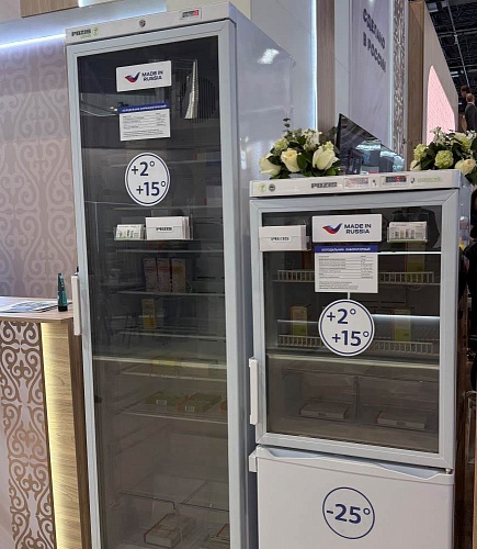 В экспозиции компании показан комбинированный лабораторный холодильник, предназначенный для хранения лекарств, образцов и других фармацевтических средств. В его холодильной камере поддерживается температура от +2°С до +15°С, в морозильной - от -10°С до -25°С. Также предусмотрены автоматическое поддержание режима и сигнализация при отклонениях.