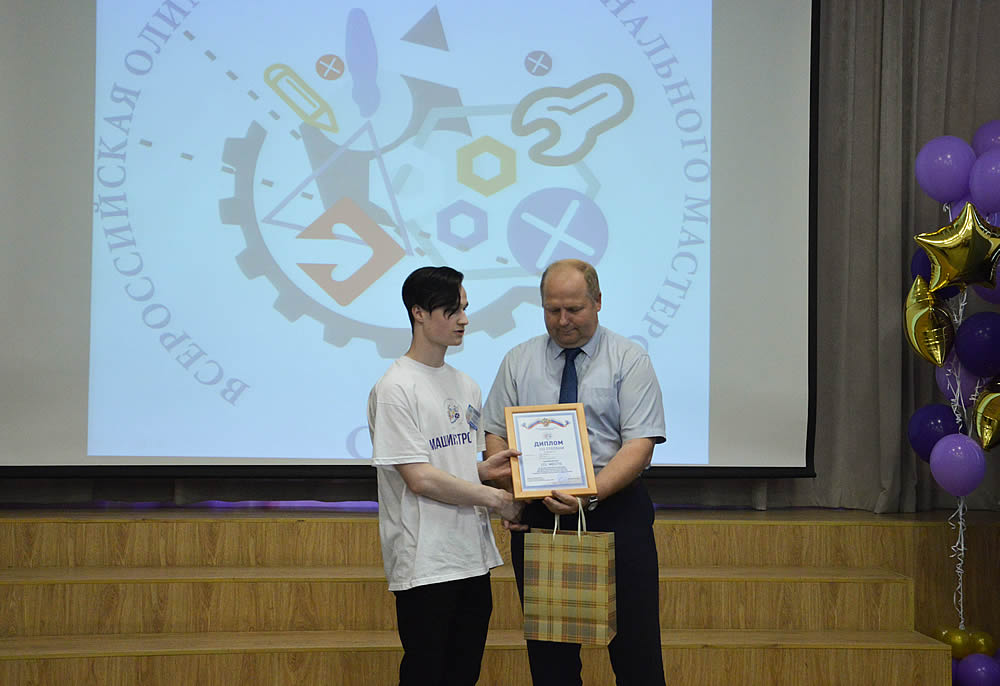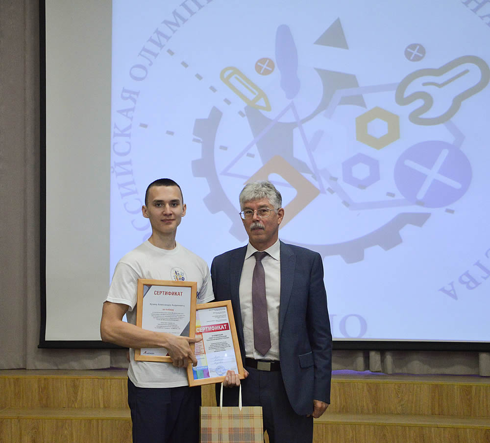 Призеру олимпиады (3 место) - Юлиану Ласковому, автономное профессиональное образовательное учреждение Удмуртской Республики «Ижевский политехнический колледж» (77,65 баллов), вручал диплом и памятный подарок председатель жюри Игорь Нечитаев.