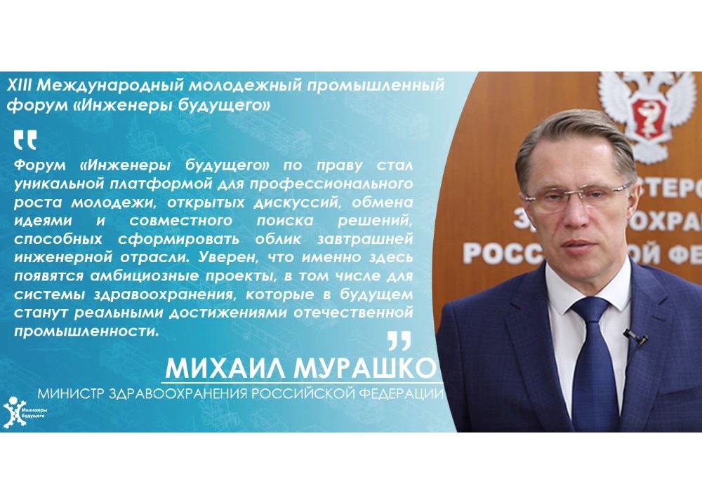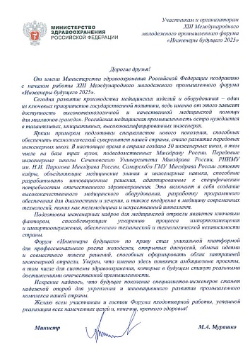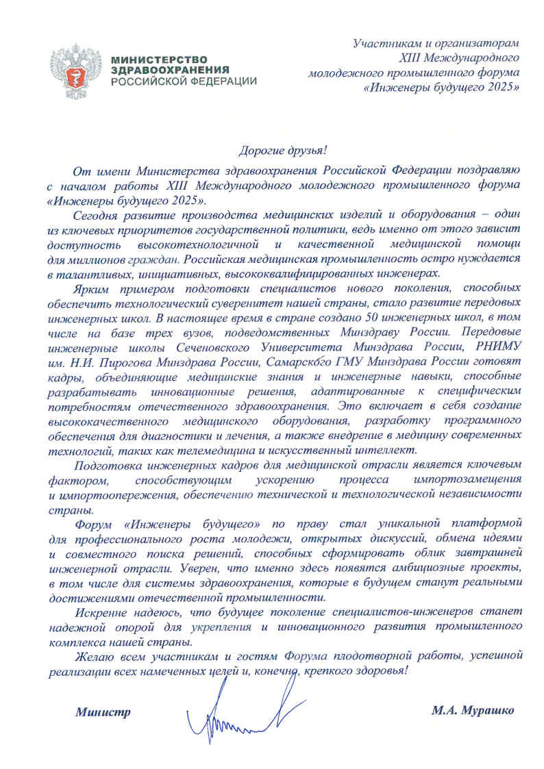 Дорогие друзья! От имени Министерства здравоохранения Российской Федерации поздравляю с началом работы XIII Международного молодежного промышленного форума «Инженеры будущего 2025».