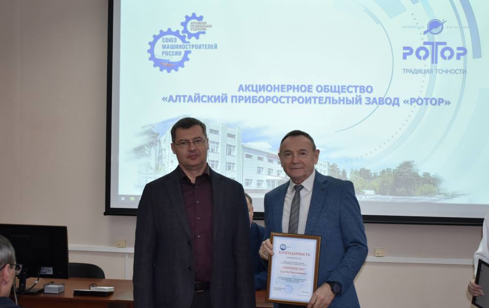 В рамках мероприятия Вячеслав Сергеевич вручил почётные грамоты и благодарности сотрудникам АО АПЗ «Ротор» за высокий профессионализм и добросовестный труд. Также председатель РО наградил благодарностями от Союза машиностроителей России сотрудников Алтайского завода прецизионных изделий и завода «Энергостройдеталь – Бийский котельный завод» за их значительный вклад в развитие машиностроительной отрасли региона.