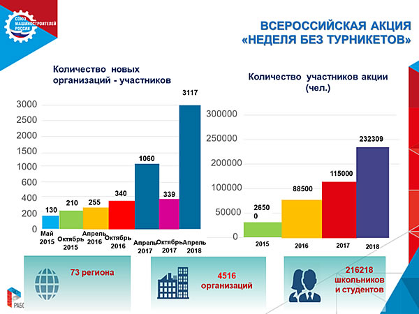 Весенняя Всероссийская акция, направленная на формирование системы профориентации — «Неделя без турникетов», проходила с 16 по 22 апреля 2018 года при поддержке Министерства промышленности и торговли РФ, Союза Машиностроителей РФ и Федерального агентства по делам молодежи (Росмолодежь).