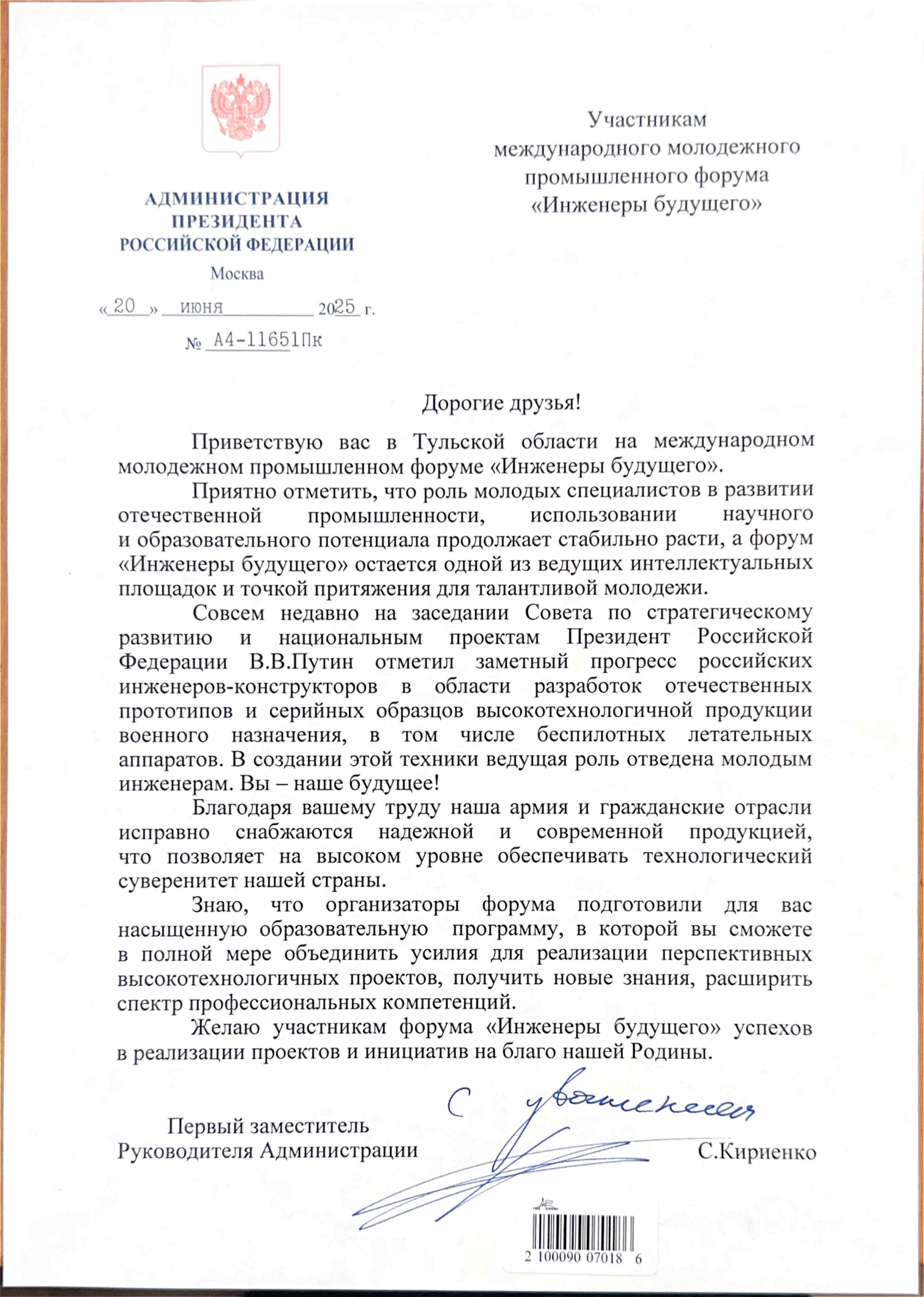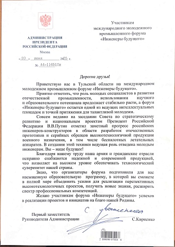 Дорогие друзья! Приветствую вас в Тульской области на международном молодежном промышленном форуме «Инженеры будущего».