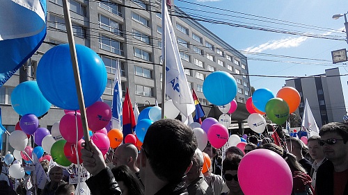 Началось торжественное мероприятие с яркого шествия демонстрантов по Ленинскому проспекту от гостиницы «Калининград» до сквера около монумента «Мать-Россия», где состоялся митинг. Участники демонстрировали красочные баннеры, шары и флаги с использованием корпоративной символики, выражая главную позицию в обществе – борьбу за справедливый и достойный труд!