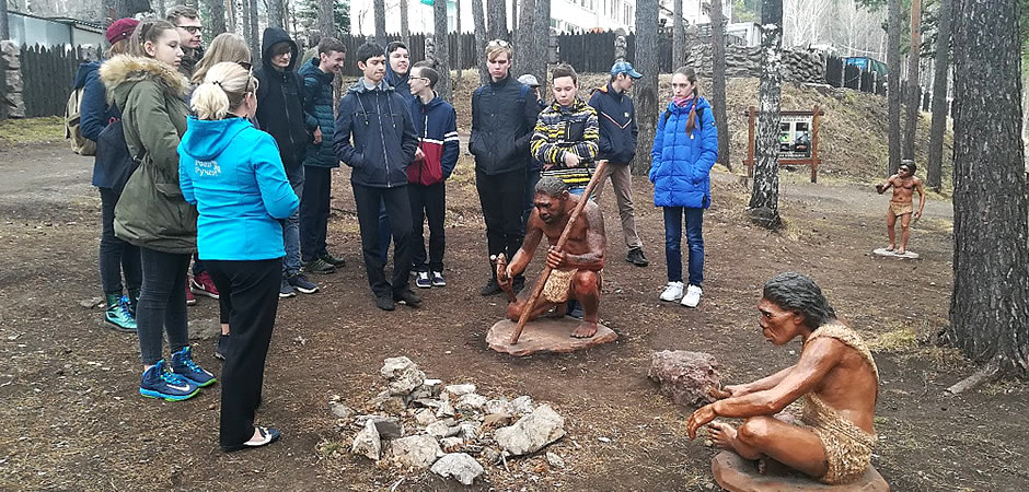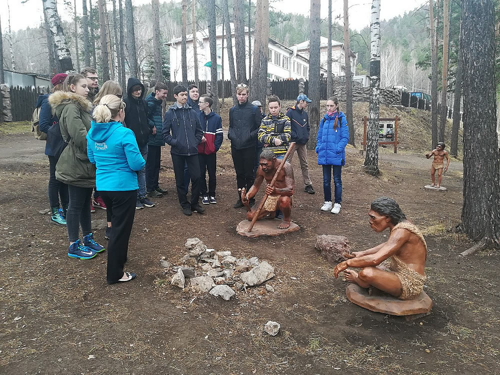 Светлана Вячеславовна Чипура провела школьников на локацию первобытной истории и рассказала, с чего началась жизнь на планете Земля. Вместе с ребятами они вспомнили несколько теорий о возникновении жизни и тут же их либо опровергали, либо подтверждали, приводя в доказательство различные аргументы. Во время такой беседы участникам проекта было предложено проверить собственные знания. Восемь добровольцев получили таблички с названиями эпох развития жизни с кратким описанием периода. Им необходимо было выстроится в ряд - от Архея до Кайнозоя. Ребята справились с заданием очень быстро и без каких-либо трудностей.
