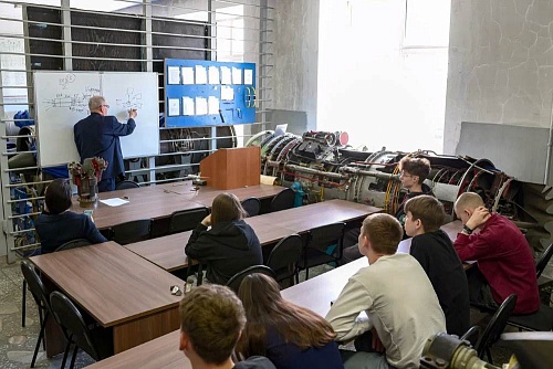 Доцент кафедры самолётостроения и эксплуатации авиационной техники Анатолий Полонский рассказал школьникам об авиационных двигателях. Занятие проходило в специализированном классе, предназначенном для изучения дисциплины «Конструкция и прочность авиационных двигателей», где размещены двигатели военных и пассажирских самолётов. Самым внушительным экспонатом в аудитории является фрагмент двигателя военно-транспортного самолёта Ил-76.